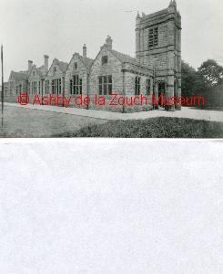 Interior of woodwork room, exterior showing tower with original main entrance, and rear view showing cycle shed far centre, 1960's approx.