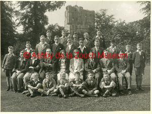 Class photo with staff - quite young boys. Hastings Tower of the castle in background. Date unknown, but possibly the 1960's.