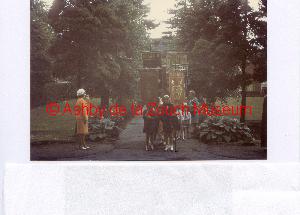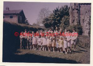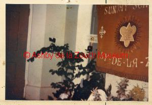 Holy Trinity Church Sunday School anniversary in mid 1960's and 1970. First photo: July 1970, children outside the church Back row L-R: Sally Claxton, Paula Claxton, Kathleen Holt, Margaret Bonser, Iris Holt. Front row L-R: Unknown,Richard Claxton, 3 unknowns, Donia Boner, 5 unknowns. Second photo: Classes with banners assembling at side of church ready to parade into church, mid 1960's. Iris Holt fron right. Sandra Fowkes (with red Class VII banner)