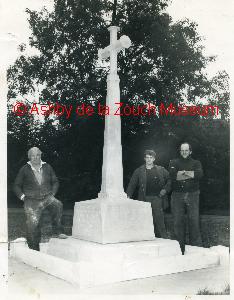 Coleorton War Memorial at the time of its erection, ?1946, with left: William Sawbridge, monumental mason of Ellistown, middle: John Spencer of Ellistown Transport and right: David Hughes of Ellistown Transport