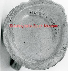 The base of a glazed earthenware jug made in the Coleorton pottery, between 1838 and 1841 marked "Wilson and Proudman".