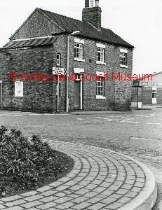 Island building on The Green - formerly the prison. Photo dates to just after previous photo, G21. Shields sign has gone. The advert on side of building for Coloerton show is still in evidence on this picture. A new sign for the Ivanhoe Community College has been erected on the lamppost. 1980-1981.
