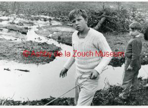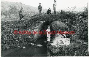 Stone bridge, (with children having a last "play") on site of the Staunton Harold reservoir, now submerged. October 1963.