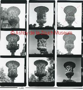 Collage of photos of the urns which stand on the corner of the terrace at Coleorton Hall. 1985