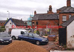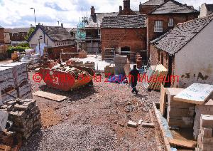 From Derby Road, rear of No.1 Shoulder of Mutton (pub) car park, showing progress of redevelopment at 11th August 2013 into a Wetherspoons outlet in 2013. Disabled persons toilet is the white single storey building with 9 high level windows.