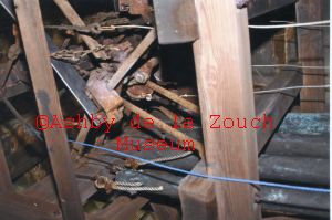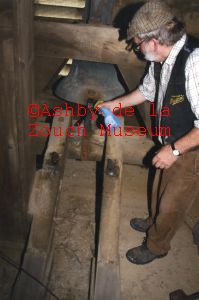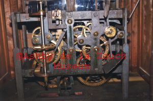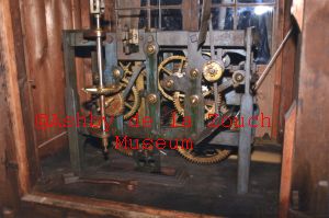 Holy Trinity Church, (opened 1840) interior of the bell tower showing the bell and hammer which was removed for repair. Second photo shows the device which operated the striking of the tubes. August 2013