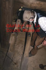 Holy Trinity Church, (opened 1840) interior of the bell tower showing Jim Holt removing the hammer which strikes the bell, being taken for repair.. August 2013