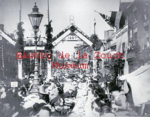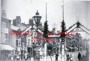 Queen Victoria Golden Jubilee 1837 to 1887. Being prepared for a street party. Businesses identified - on right - White Hart (public house) and on left: Town Hall.