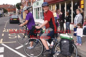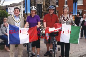 "Home to Rome" cycle challenge for the "Wishes for Kids" charity, undertaken by former mayor Richard Bebbington & his wife Angela, leaving Market Street (war memorial in background). Being seen off by friends, family and District Council Chairman Geraint Jones, and Ashby town mayor, Gill Hoult. 18th August 2013.
