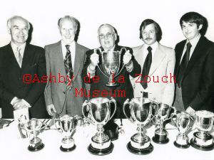 Ashby Bowls Club presentation 1979/1980. L to R: Maurice Taylor (secretary), Fred Hill, John Harrris (president), Roger Bird, Barry Whyatt.