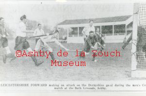 Newspaper cutting of a Leicestershire v Derbyshire hockey match on the Bath Grounds, Ashby. Also details of the 11 team members, of which S.Hurd of Ashby is one. Possibly in the 1950's but date unknown.