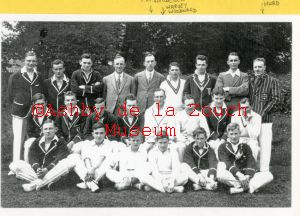 Annual cricket match between the school XI and an Old Boys XI in approx 1927. Back row 5th from left T.A.Woodcock (headmaster), next is Harvey Woodward. Extreme right is Arthur Hurd. Others are unknown. Duplicate of photo P13-0159