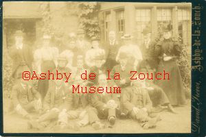 A named group of people photopgraphed by David Trevor (an Ashby photographer who came to the town in the late 1870's and was still operating early in the 20th century) Back row L to R: Mrs J Morley, Mr. Morley, H. Tyler, Mrs. S. Sturgess, Mr & Mrs. T.Williscroft, R.Towle, Mrs. T Pratt, Mr & Mrs. Reggins. Centre L to R: Mrs. Page, Mrs. J.Leawood, Mrs. Towle, Mr. D Trevor. Front row L to R: Mr. T Jarman, J. Leawood, A.C.Page, S.Sturgess, T. Pratt, T.Heafield.