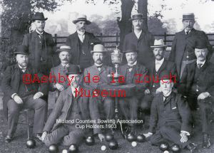 Midlands County Bowling Association, Cup holders 1903. Back row L to R: Seabourne, A. Orchard, R.J.Timms, W.H.Pickering. Second Row: L to R: T. Buck, E Bullen, R.J.Carruthers, G.D.Orchard, H. Bullen. Front row: W.Woodward, G. Farmer.