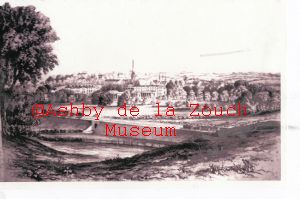 View from where Brendan Way (formerly Spion Kop) is now, looking over railway line (cattle arch to left) and across Bath Grounds. Spa buildings and Trinity church with spire clearly visible in mid background. Probably around 1850 (railway line was opened in 1840)