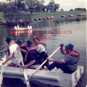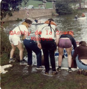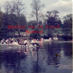 Rotary Club of Ashby de la Zouch, 1979-80 sponsored raft race on lake in front of Staunton Harold Hall. In Standard Soap raft L to R: Roy Stobbs, tony Ewards, Bob Methven, Trevor Johnson and Tom Brock (M.D) a rear.