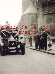 Wedding car outside Our Lady of Lourdes RC church (built 1913). Vehicle reg No: AB640. Make - not established.