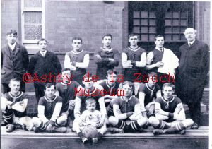 Ashby Primitive Methodists F.C. in approx 1910. Back row L to R: Southam, Harold Grew, Ted Perry, Frank Poyser, Vic Lewis, Timms, Rev. Fawcett. Front row L to R: Hector Smedley, Jack Farmer, Tim Farmer, Charlie Perry, Michael Jones, Tom Farmer, Harry Dennis, Harry Cartledge. Front: mascot - Jim Slater.