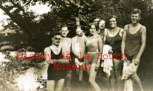 First photo - group of swimmers at Willesley lake 1933. L to R: German, Marion ?, Rhona Vale, George Joyce, Nora Blakesly, Peg Musson, Reg Vale, JWH. Lower photos: Samuel urner in his garden on Packington Road, Ashby.
