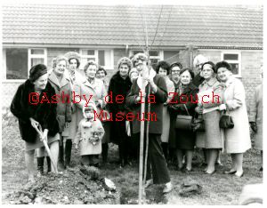 Hood Court flats completed in 1981. Mrs. Marjorie Hirst, chairman of Ashby Hastings Townswomen's Guild prepares to put the first shovel of soil on a flowering cherry treet, held by Mrs. Evelyn Roughton, chairman of the Gild's Social Study Group. Tree given tot he residents of Hood Court.