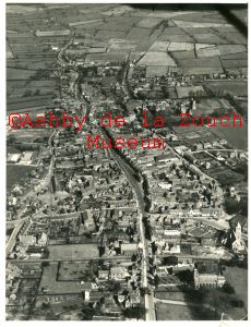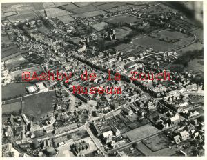 Aerial photo of Ashby in around 1953/54. South East - showing all major roads in town. On extreme left - Ivanhoe School in process of construction (opened in 1955). Gas works still open, bottom left. Note: all the courtyards are still evident.