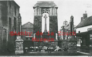 War Memorial with view of Baptist church in rear. Premises of Belton & Sons (painters and decorators) on extreme right in Brook Street. They were in those premises in 1916 and 1936. Likely date of photo is late 1920's.