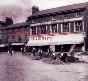 printing office/ Floral Hall (used by G.Brown and Beadsmores). Shows workmen preparing to lay tramlines in 1905.