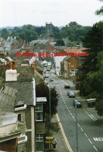 Kilwardby Street 1999. Looking down street towards town centre. Trees now obscure Trinity church on right. St. Helen's tower in distance.