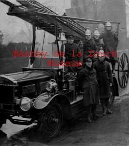 A 1912 Merryweather turntable ladder fire engine. Photo approx 1920's with Ashby Fire brigade members.