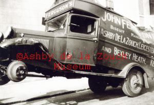 Damaged delivery vehicle ?make, model. Probably around 1936. Liveried: John Ferguson Ltd, Biscuit Manufacturers, Ashby de la Zouch, Leicestershire and Bexley Heath, Kent. In local directory 1936. Think they were bought out by Meredith & Drew who used the site of the old workhouse in Nottingham Road for their transport depot.