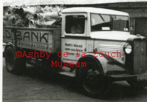 Moore's Bedford open back truck, 1937 approx. Reg No: FRE 68. Cab liveried "Moore's Haulage, Ashby-de-la-Zouch, Phone 140". Truck liveried " RedBank, bricks, ridges". This was their first motor vehicle. Driver: Charlie Moore of Measham.