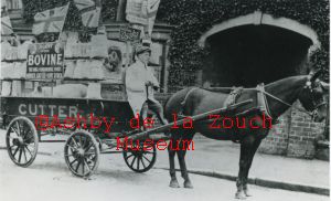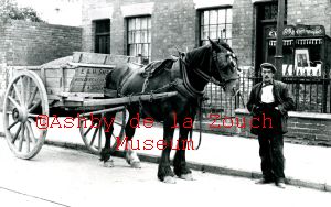 Mr. Broadhurst with Blossom outside Mr. Boss' photography studio at No. 9 Derby Road. Ernest and Hector Smedley, the cart's owners, were builders, contractors and undertakers. Mr. Boss is shown as occupying these premises in the 1908 census. Date of photo is approx 1908.