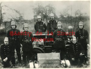 Ashby Urban District Council Fire Brigade with petrol fire engine. Taken at Willesley lake in 1921. All firemen were council workers with other jobs! Back row: L to R: Walter Webster, Augustus Pegg (captain - also foreman of the council workers)..Next row: L to R: George Broadhurst, unknown, William Vicarage 1st engineer, two unknowns. Bill Randall on extreme right at the front. Appliance housed in Brook Street from 1898. Walter Webster was highly decorated in WW1 (note:he is wearing his medal ribbons) and was awarded the DCM and MM.