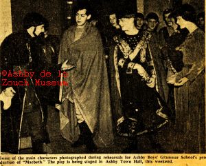 Newspaper cutting of main characters during rehearsals for Ashby Boy;s Grammar School's production of "Macbeth" at Ashby Town Hall, 4th. February 1966.