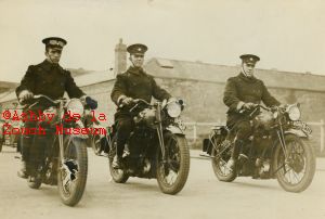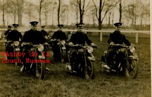 Leicestershire Motor Cycle Police, in 1930's. Possibly taken at Leicester racecourse. Cyril Blundy is front left (later to become Inspector Blundy at Ashby)