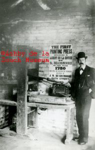 The first printing press in Ashby, introduced by Sl. Beadsmoore in 1780, Photographed in premises of J.W.Beadsmoore, with Mr. Beadsmoore, in Bath Street. It survived in dilapidated form in the basement of the Floral Hall in Bath Street, until the latter was demolished in 1967.