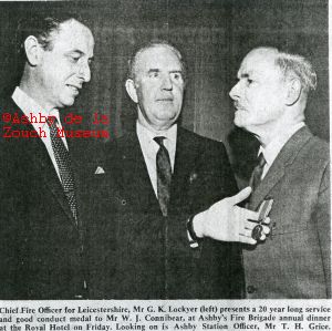Leicestershire & Rutland Fire Service. Guests at social held at Ashby fire station when presentation made by Chief Fire Office Mr. G.K.Lockyer to M. W.G.Conibear to mark his retirement as a part-time fireman after 20 years service. Looking on is Ashby Station Officer Mr. T.H.Grice. Lower photo shows Mr. Conibear receiving a clock from assistant chief fire officer Mr. K.J.Martin.