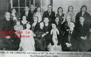 Some of the committee and helpers at the "At Home" held in connection with Burton Road Methodist church. Back row L to R: Mrs. Cox, Percy Cox, Walter Ward, Gwen Baker, unknown, Ethel Ward, Mrs. Richards, Mrs. J. Cook. Second Row L to R: Unknown, Mabel Cleobury, Noreen Cleobury, Mrs. Smedley, Lena Smedley, Mrs. Minnie Ward, Mrs. Salter, unknown. Front row L to R: Gladys Underwood, Joan Smedley, Muriel Smedley, and parents Mr & Mrs Smedley.