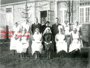 Ashby hospital staff and doctors, in circa 1936 at rear of hospital in garden (which is now a car park). Standing L to R: Nurses Shillcock and Heath. Dr. Davidson, Mrs. Fisher Jesson, Dr. Mitchell-Innes, Nurses Jones and Ramsell. Seated L to R: Nurse Goodwin, Sister Powell, Matron Arkinstall, Sister Seymour, Nurse Sharp.