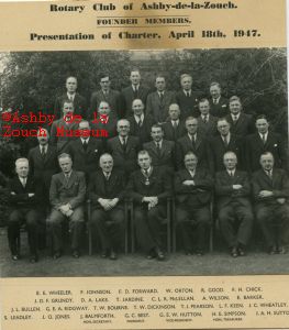 Rotary Club of Ashby de la Zouch, presentation of their charter, April 18th. 1947. Founder members: Back row L to R: E.E.Wheeler, F. Johnson, F.D. Forward, W. Orton, R. Good, F.H.Chick. 3rd row L to R: J.D.F.Grundy, D.A.Lake, T. Jardine, C.L.R.McLellan, A.Wilson, E. Barker. 2nd row L to R: J.L.Bullen, G.E.A.Ridgway, T.W.Bourne, T.W.Dickinson, T.J.Pearson, L.F.Keen, J.C.Wheatley. Front row, seated L to R: S. Leadley, J.O.Jones, J. Balmforth (hon sec), G.C.Best (president), G.E.W.Hutton vice president), H.E.Simpson (treasurer).