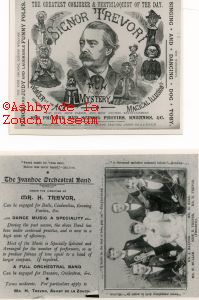 Promotional cards for the businesses operated by Mr. Harry Trevor in the late 1890's. Promoting Signori Trevori, illusionist etc. and his Ivanhoe Orchestral Band - with band members, Back row L to R: Mrs. A Baxter, Mr. D. Kirk. Front row L to R: Mr. W. Mullin, Miss E. Trevor (pianoforte) and Mr. Harry Trevor.