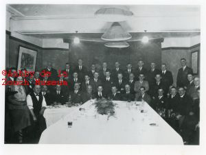 Members of the Ivanhoe Social Club when it was situated over Fishers offices in about 1935. Date unknown, possibly 1950's. Various persons identified (for plan - see original archived photo): Identified: Jonny Brown worked at Crane & Walton, Bev Gilbert married Hilda Trevor whose grandfather becaome Ashby's first photographer, Mr. Mudiman lived in Prior Park, Bert Hunt from Melbourne & ran a silk factory with his brother, Joe Laban from Melbourne ran a haulage company, Mr. Merriman ran a greengrocers at No.20, Market Street, Freddy Thornly ran an animal feed shop at No.21 Market Street, George Walker lived on Burton Road and worked for Calder Chemicals in Lower Church Street - site of Lyric Rooms, Mr. Swift ran a cafe in Market Street (grandfather of Peter Swift who runs shop in Packington, Harold Pass, Ashby UDC, Charlie & Mrs Ridgway (stewards of the club for many years), Joe Staley had shop on The Green opposite the Bowling Green pub, Shirley Plant ran TV & radio shop in Market Street,William Edwin Richards born 1888 at the Castle Inn where father was landlord. In 1896 the family moved to Ferrers Arms Lount to 1926. He worked for Marstons Burton brewery, Charlie Perry worked in a colliers office and lived in Kilwarby Street, Mr. Pickering also worked at colliery offices and lived in Upper Packington Road.