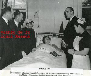 Ashby hospital - March 1957. Opening of new maternity extension. "VIP" visitors: L to R: David Bentley, Chairman Hospital committee, Mr. Bodell, hospital secretary, Matron Spencer, hospital patient, Mr. Martin, Chairman Sheffield Hospital board, Sister Thompson.