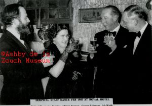 Ashby Hospital staff dance, February 1960 at Royal Hotel. L to R: Richard Derrington-Fenning - owner of hotel, Matron Spencer, George Ridgeway, Mr. Webb, chairman Leicester House Committee.