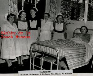 Ashby hospital - March 1957. Opening of the new maternity unit. L to R: Nurse auxilliary Lees, Nurse Jarman, Sister Carberry, Nurse auxilliary Glover, Nurse Richards with hospital patient
