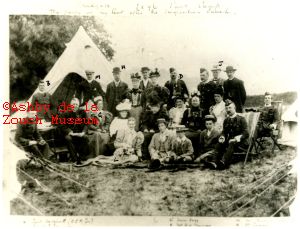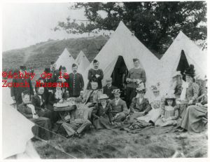 'A' (Hastings) Company, 1st. V.B. Leicestershire Regiment, Bradgate Park camp 1896. Party at "my" tent after inspection. The following are identified: A: Capt Hackett, B: Lieut G. German, C: Lieut J.M. Curtois, D: Lieut E. Stevenson, E: Lieut J.E. Jarratt, F: Canon Denton, G: Miss Hogg, H: Mr. W.A. Musson, I: Mrs. Musson, J: Mr. Stevenson, K: Mrs. Stevenson, L:Mrs. Margaret German, M: Mr. H. Betterton, N: Dr. Logan, O: "Whiskers, "my" batman.