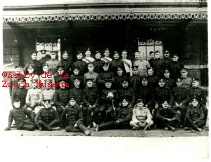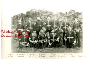 'A' (Hastings) Company, 1st. V.B. Leicestershire Regiment pre WW1. Front row: L to R: Allcock, Matthews, Howard, Cutter, Mark Hatton. Back row L to R: Hanson, Smith, W. Cutter, Baxter, R. Allcock, Clay, Beadsmoor.