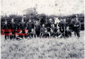 Church parade, 'A' (Hastings) Company, forming up in Leicester Road. The three men facing the parade are from left: S.M. Tucker, Capt. T.E.Jesson, and Lt. Col. German. Small boy on right is Guy German.