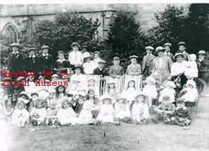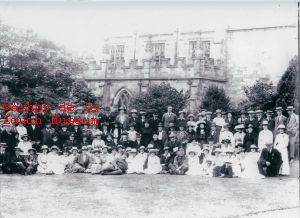 Outside Trinity church at Staunton Harold. A group photo of probably tennants of the estate, in approximately 1914.