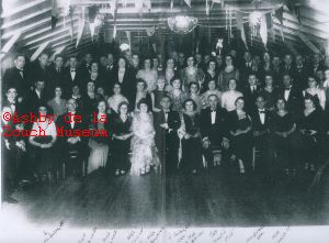 Staff party for New Lount Colliery, Newbold Brick and Pipe Works and Newbold Haulage held at Newbold Village hall in approximately 1934. Back row: 9 unknowns, Joe Laban, 3 unknowns, Bill Cooper, unknown. Next row: Jim Richards, 3 unknowns, Mrs. Richards, unknown, Mrs. Bill Cooper, Miss Nancy Warren, 2 unknowns, Miss John Martin (Carter), George Widdowson, Idwel Taylor, 7 unknowns. Next row: Ted Court, Mr. Menxies, 6 unknowns, Miss Vannina Hodges, Miss Monica Hawkins, Miss Doris Court, 9 unknowns. Front row: Dick Hawkins, Mrs, Elsie Hodges, Sam Bollard, Mrs. Evans, Mrs. Tamar Court, Mrs. May Hawkins, Frank Hodges, Mrs, Henrietta Hodges, Mrs, Martin, Handel Evans, Mrs. Sarag Naisbitt, Mrs. Laban.